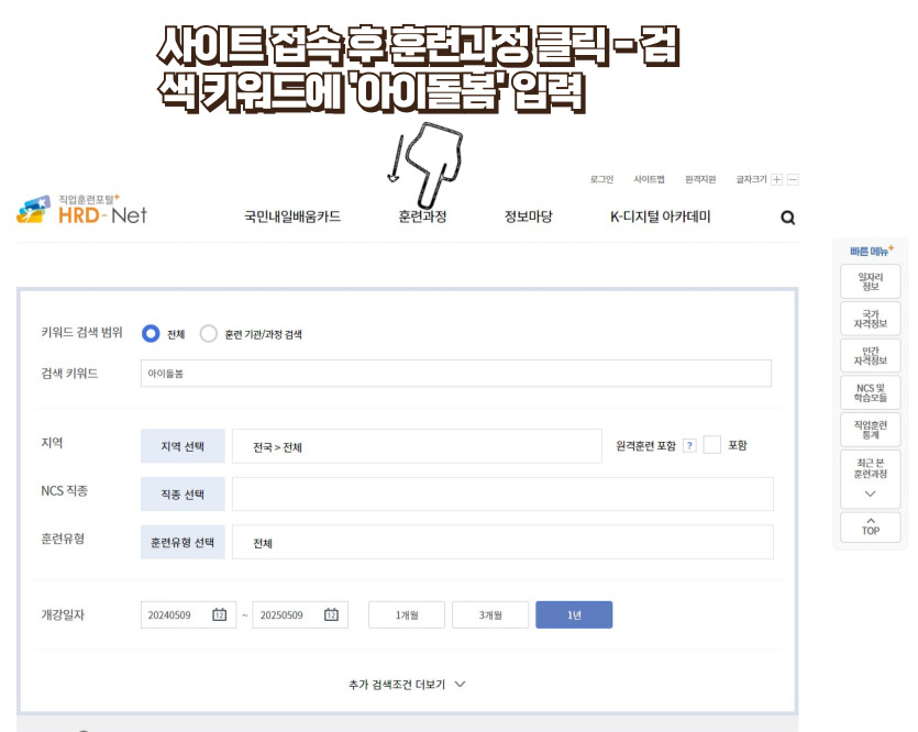 신청은 HDR-NET 훈련과정 검색에서 '아이돌봄'으로 검색하셔서 찾으시면 됩니다.