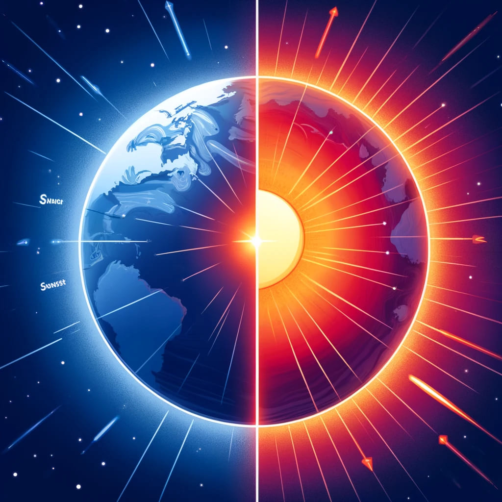 해가 지거나 떠오를 때, 태양빛은 지평선에 가까운 경로를 지나게 됩니다. 이때 낮 동안 태양이 머리 위에 있을 때보다 빛이 대기를 통과하는 거리가 더 길어집니다. 태양빛이 대기를 통과하면서 짧은 파장의 빛(파란색과 보라색)은 더 많이 산란됩니다. 따라서 태양이 지평선에 가까워지면, 빛이 더 긴 경로를 지나면서 파란빛과 보랏빛이 거의 모두 산란되어 지구 표면에 도달하지 않게 됩니다.
